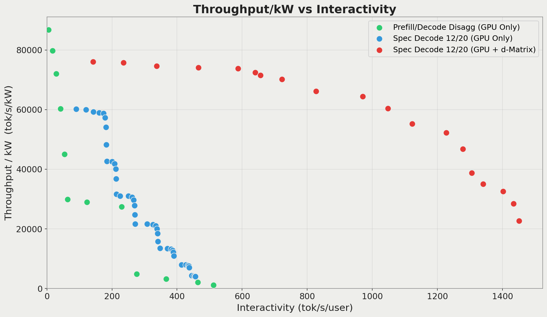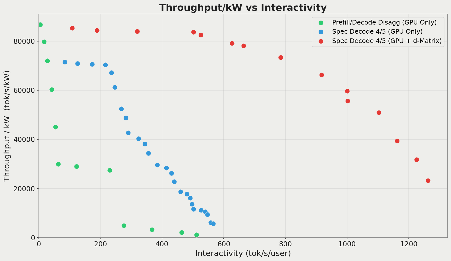 By adding d-Matrix to our setup, we can get a more globally optimal inference setup. Depending on your optimization target, offloading speculative decode to d-Matrix can deliver 2-10X better interactivity for the same energy efficiency, or significantly better throughput/kW at the same interactivity.